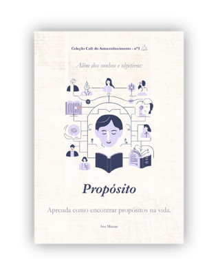Eu tenho escrito livros para uma coleção que, carinhosamente, dei o nome de Café do Autoconhecimento, e o livro n°3 dessa coleção é sobre propósito. Essa coleção é composta por e-books interativos, que trazem assuntos de grande relevância para a qualidade de vida e desenvolvimento pessoal, como planejamento estratégico, gestão do tempo, gerenciamento das emoções (a ser lançado), atenção (a ser lançado), memória (a ser lançado).